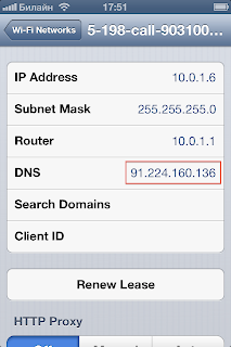 Откройте настройки wi-fi и нажмите на синюю стрелку напротив вашей сети. Удалите всё что есть в строке DNS и впишите туда: 91.224.160.136Готово!